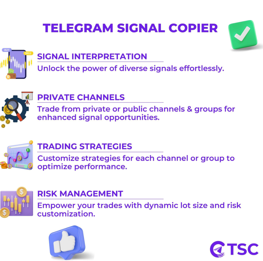However, our Telegram Signal Copier will let you set your own Stop loss and take profit levels according to your preference. If you come across forex signals that have a promising setup but a less than ideal Risk-to-Reward ratio, you have the option to utilize the Telegram Signal Copier to tailor the risk-to-reward ratio to your specific requirements. We are dedicated to making forex trading easier for you, and we make sure that Telegram Signal Copier always puts your convenience first.