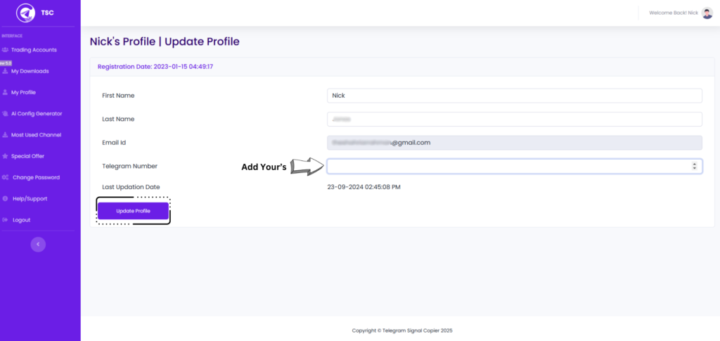 Click Update profile and enter your Telegram number, plus the country code. Now you can see that number has been added here.