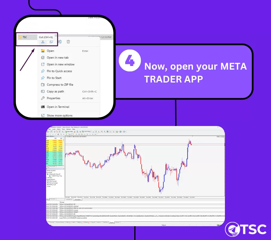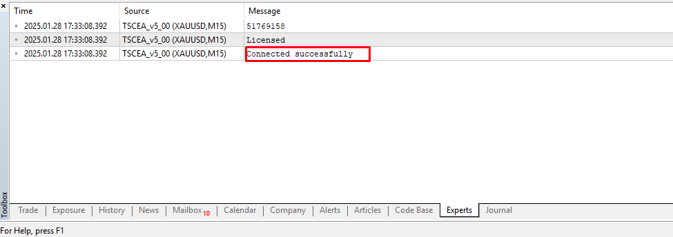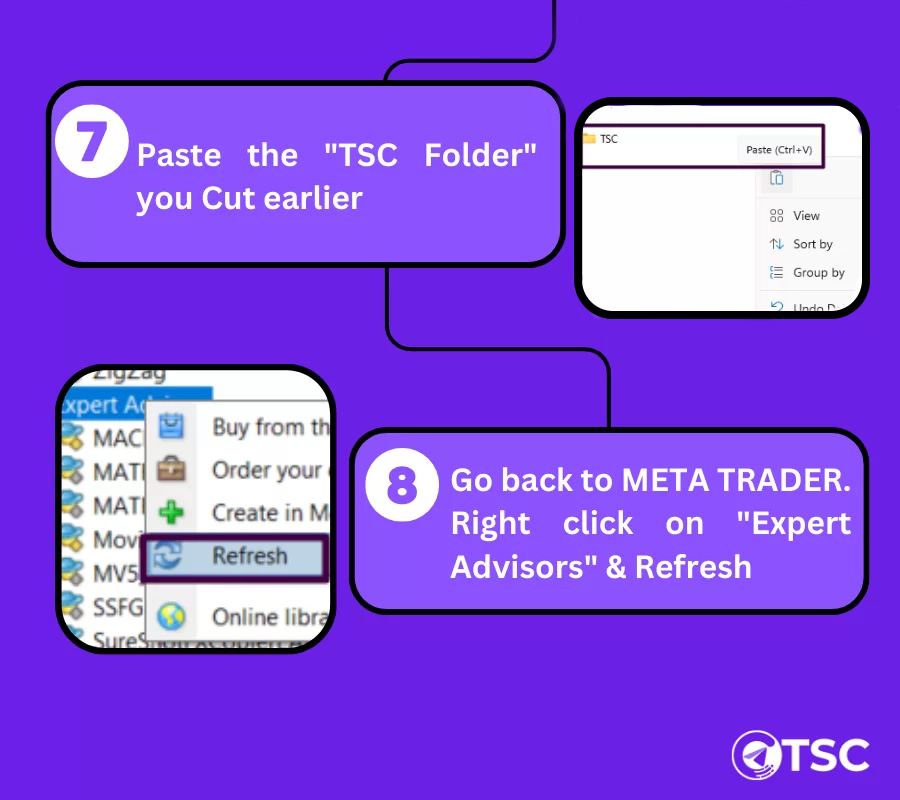 When you are done with these steps, go back to your MetaTrader app, right-click on the EXPERT ADVISORS option and refresh. You will see the EA working properly and the message showing the TSC Copier connected successfully.