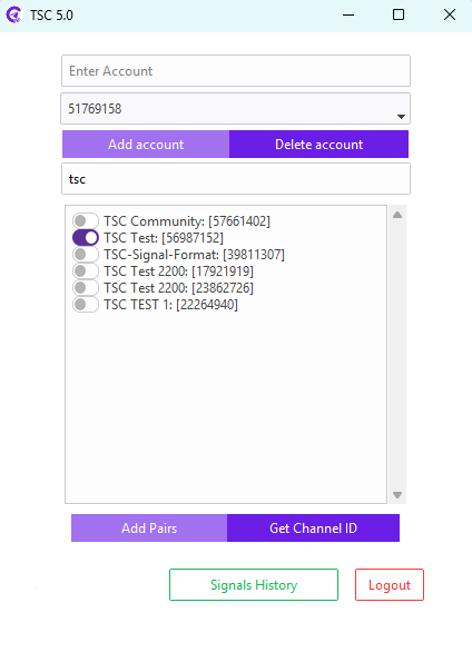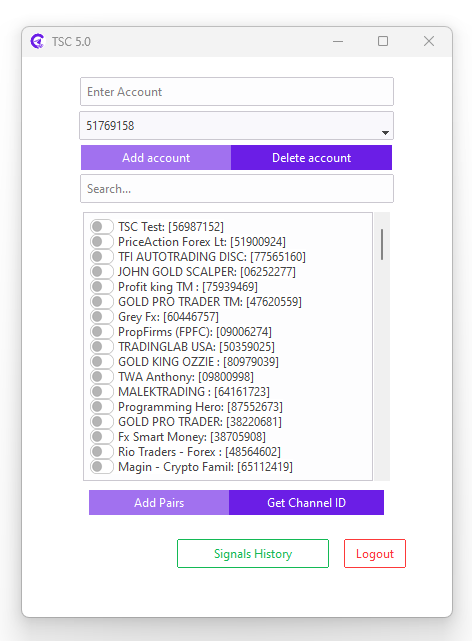 First, open your Telegram Signal Copier, and according to your subscription plan, enter your mt4/5/c-trader account and click the Add account button.