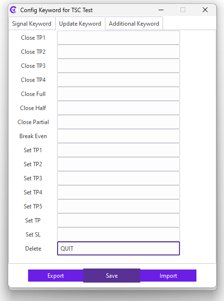 For example: Our signal provider commands QUIT SL keyword for removing the SL on the trade. So, we need to enter QUIT SL keyword in the Remove SL field.