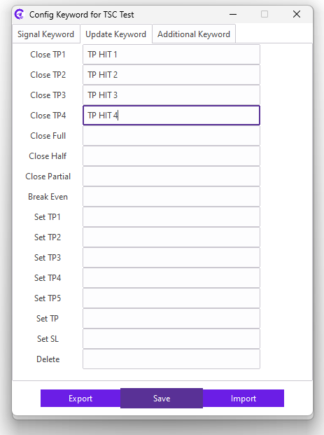 For example: Our signal provider uses the TP HIT 1 keyword in the reply message for the closing TP1; we need to enter the TP HIT 1 keyword in the Close TP1 field