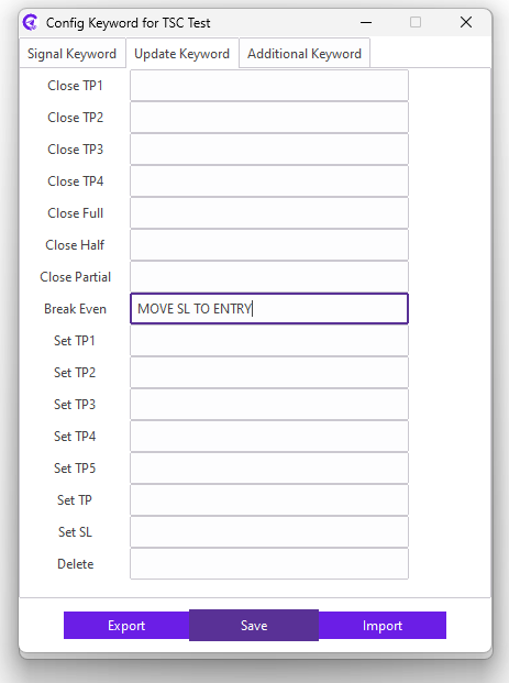 For example: Our signal provider uses the MOVE SL TO ENTRY keyword in the reply message for moving the SL price to the entry price; we need to enter the MOVE SL TO ENTRY keyword in the BREAK EVEN field.