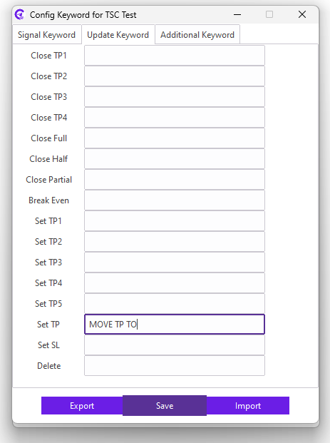 For example: Our signal provider uses MOVE TP TO keyword in the reply message for moving all the TPs at the same price together; we need to enter MOVE TP TO keyword in the Set TP field.
