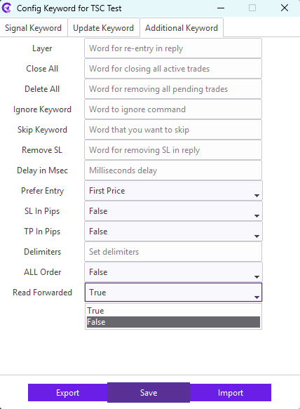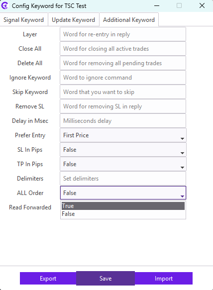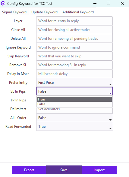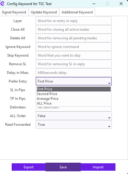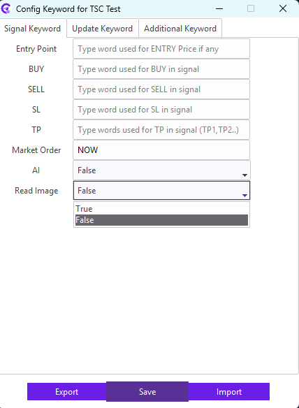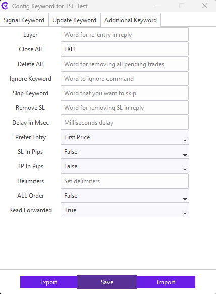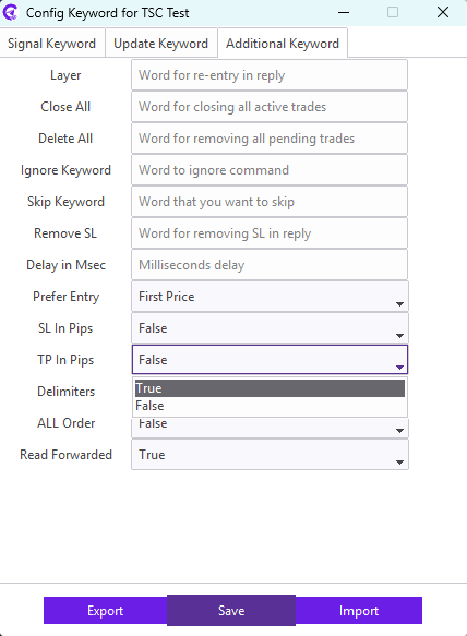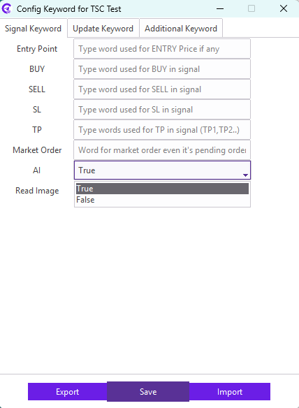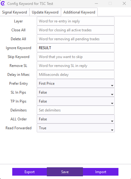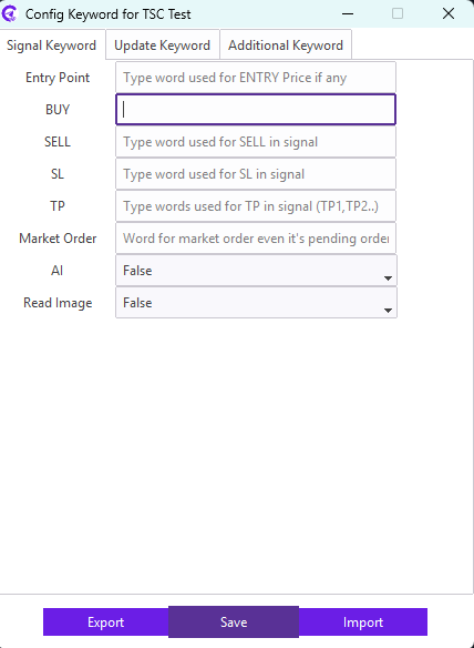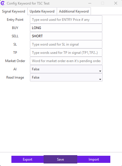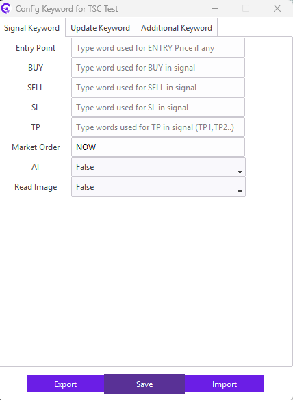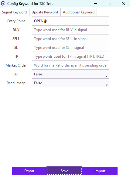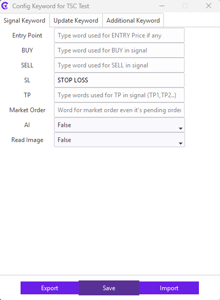For example: Our signal provider uses STOP LOSS keyword in the signal for the SL; we need to enter STOP LOSS keyword in the SL field. Similarly, TAKE PROFIT1, TAKE PROFIT2, TAKE PROFIT3 keyword in the signal for the TP; we need to enter TAKE PROFIT1,TAKE PROFIT2,TAKE PROFIT3 keyword in the TP field.