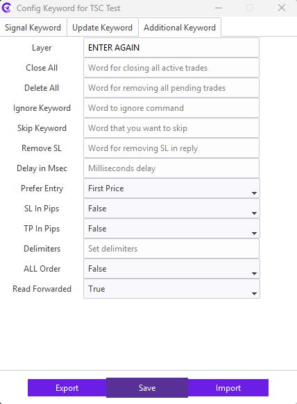 Some telegram signal providers command to re-enter a previous signal posted in the channel. To follow the command, exact keywords (from the reply message) need to be entered in the Layer field.