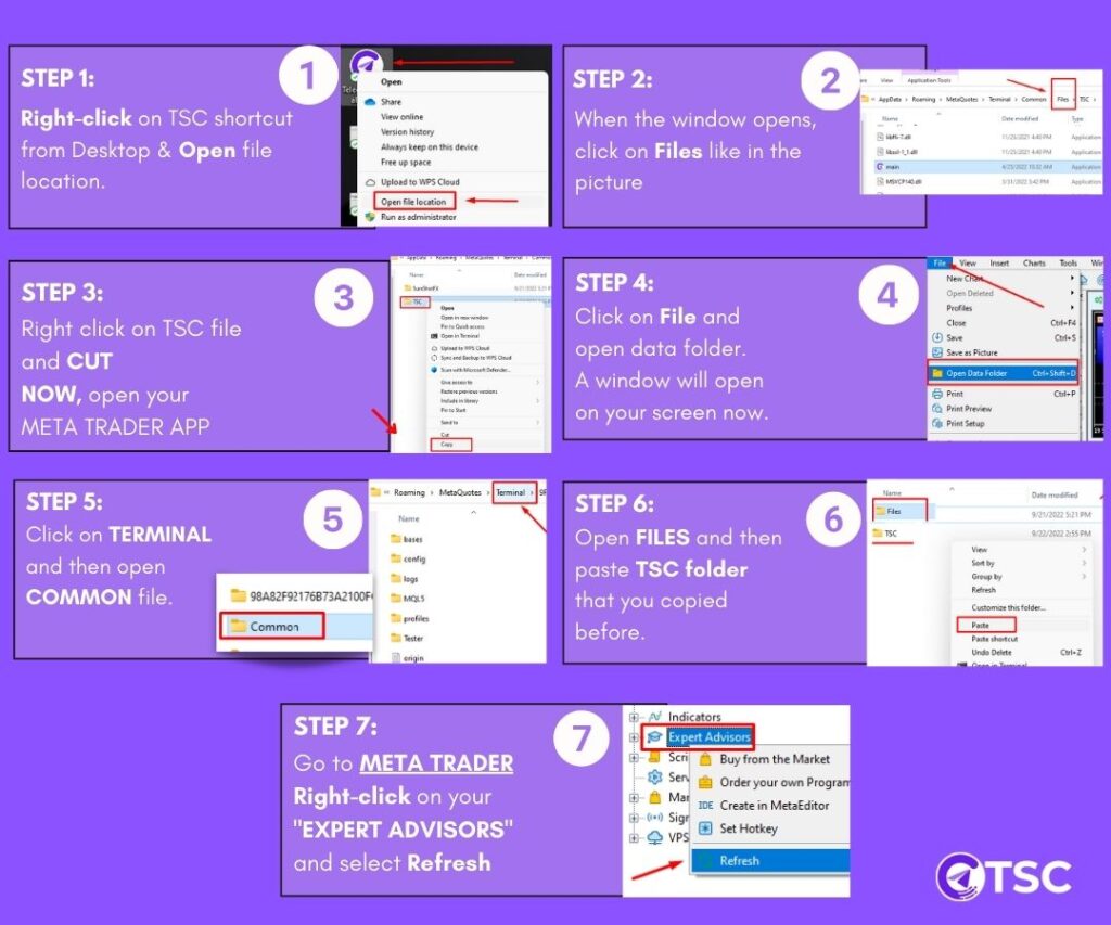 To check this, select the TSC EA from your Meta Trader, and open the Data folder with CTRL+SHIFT+D. Select Terminal and go to Common.