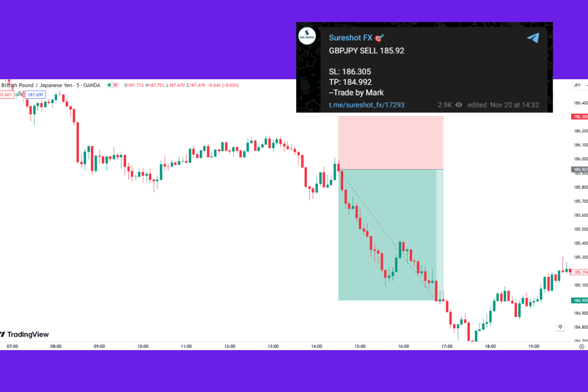 The first GBPJPY sell trade was shared during the London session around the market price 185.92. It was a trending move taken after the liquidity sweep on M15 timeframe, with a clear 1:2.5 RR risk to reward in mind. The price just melted down within the session as you can see from the chart below. We made around 90 Pips in profit from this trade.